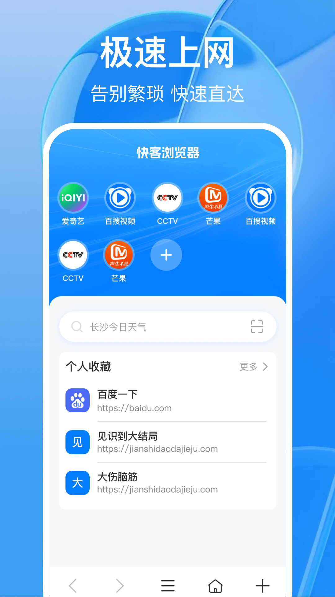 采用极简界面,包括体育财经、娱乐资讯、实时热点,浏览更省流量,运行流畅快速,让您高速安全上网