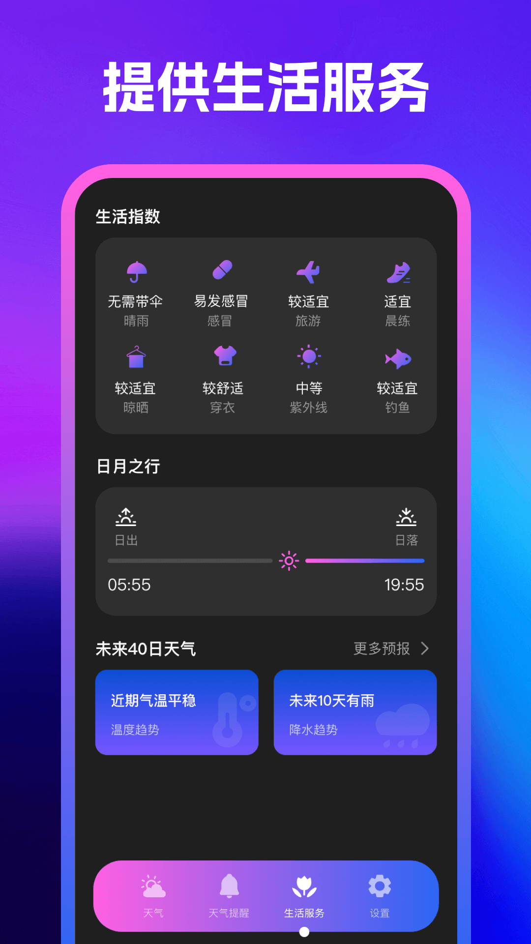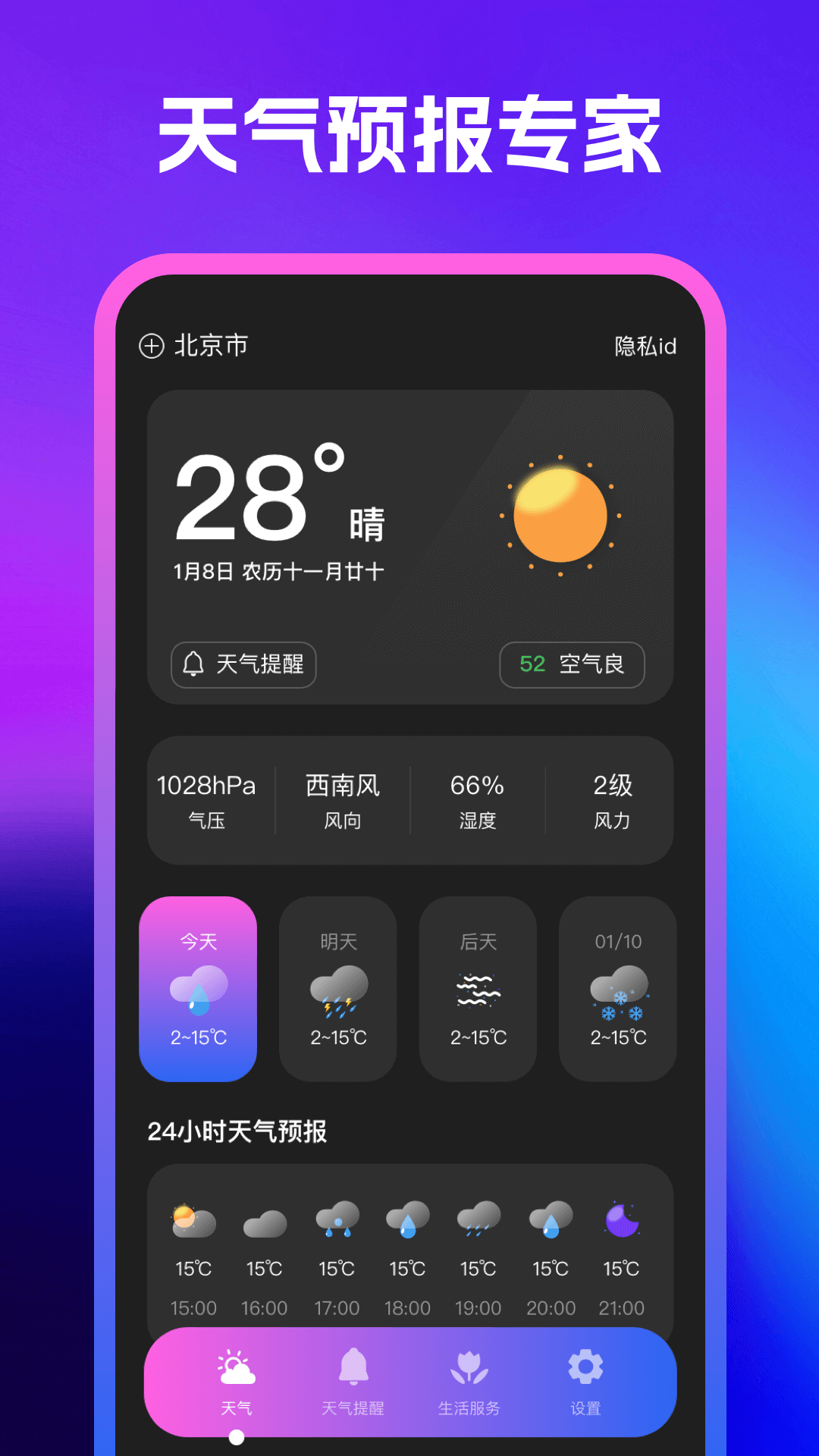 一站式满足您的出行与生活需求,核心功能全覆盖:实时天气查看,精准掌握当前温度、降水、风力等基础气象数据;24 小时天气逐时预报,助力合理规划当日行程;空气质量监测,同步 PM2.5、AQI 等关键指标,守护呼吸健康。