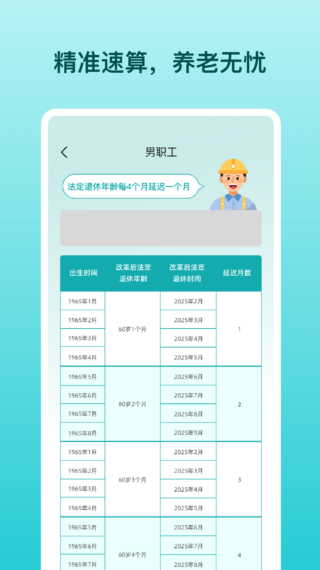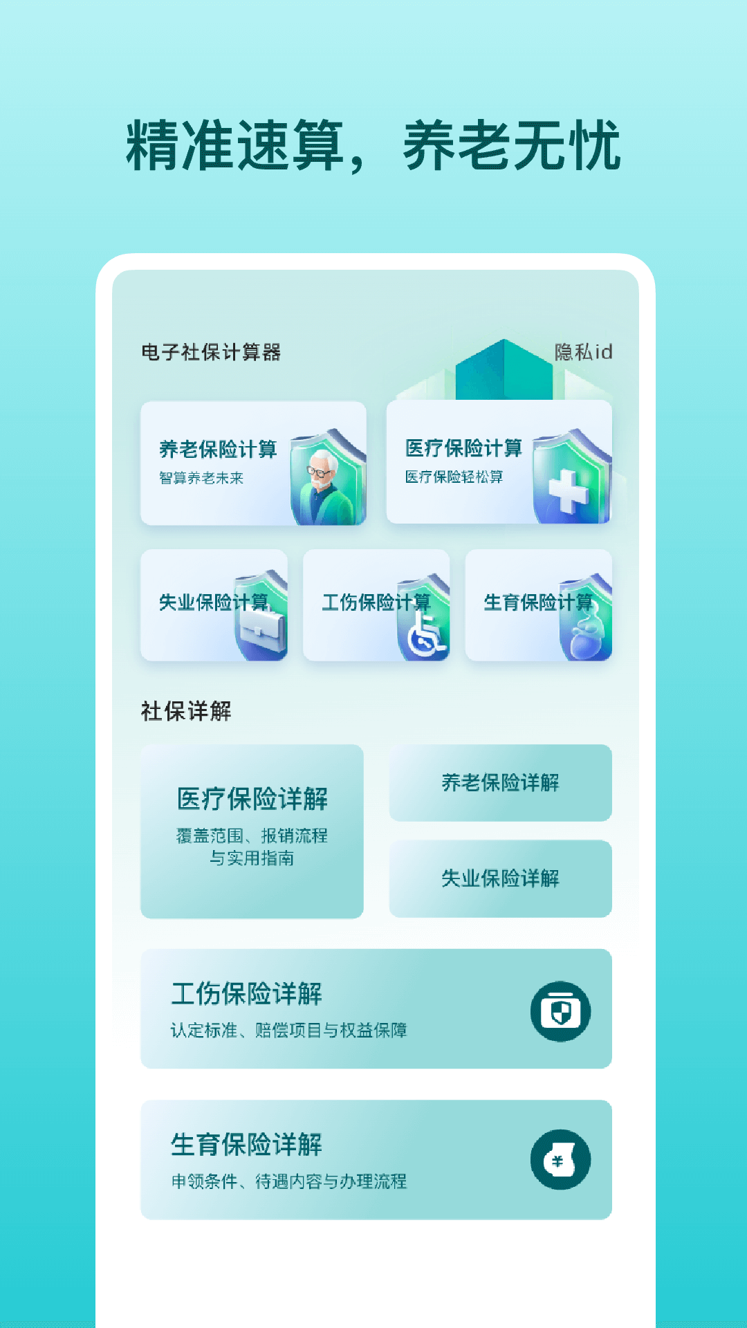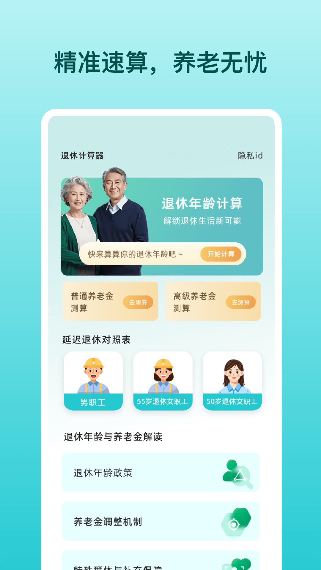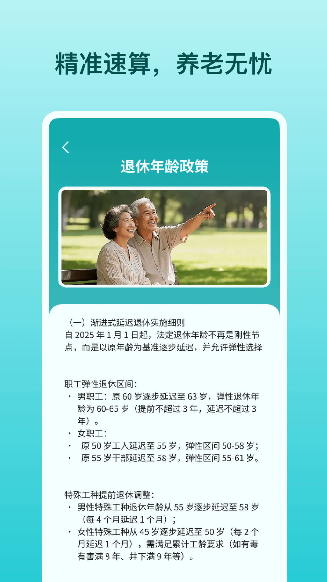 应用主功能包含退休年龄计算和养老金测算,帮助用户查看社保详解