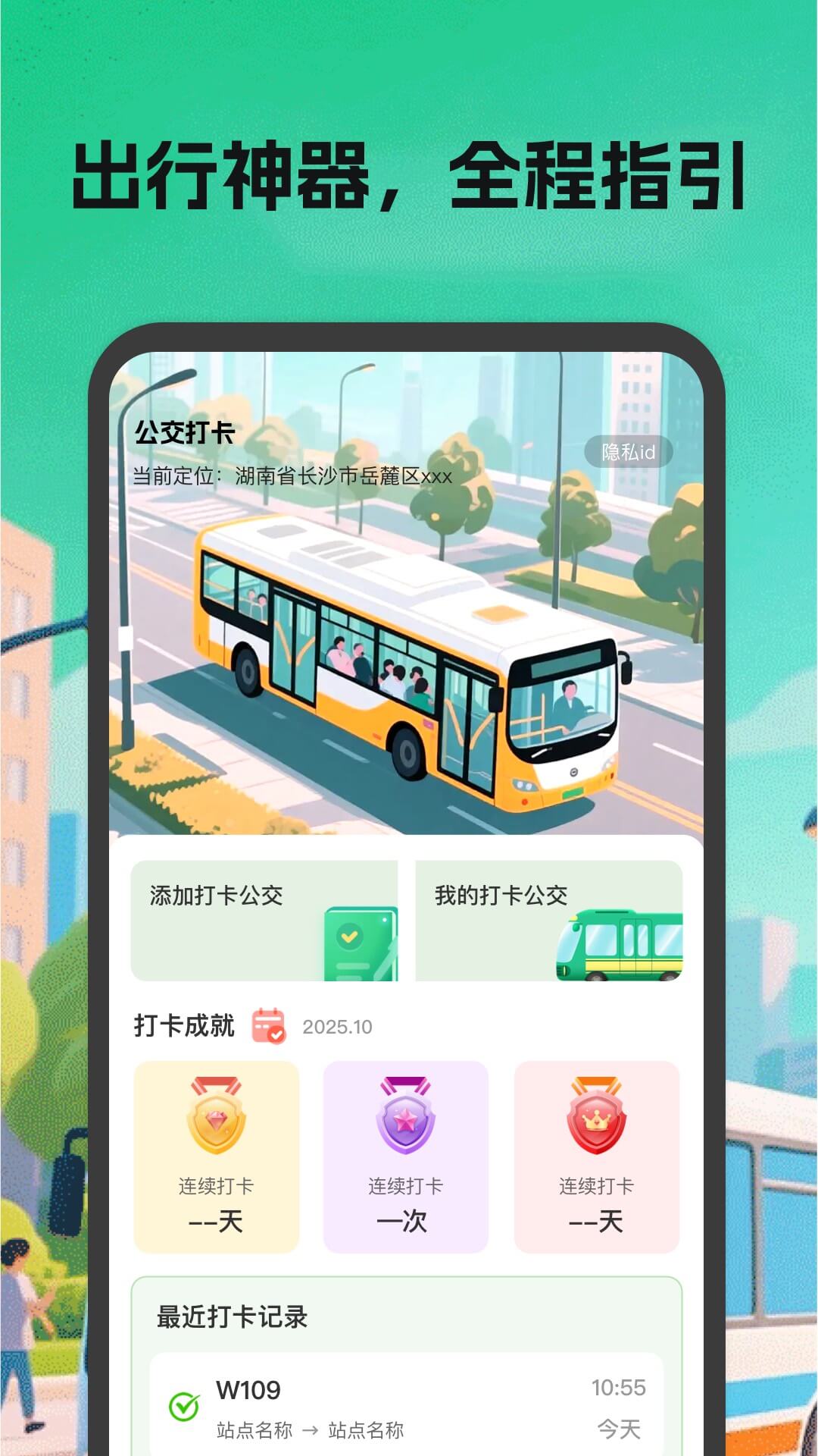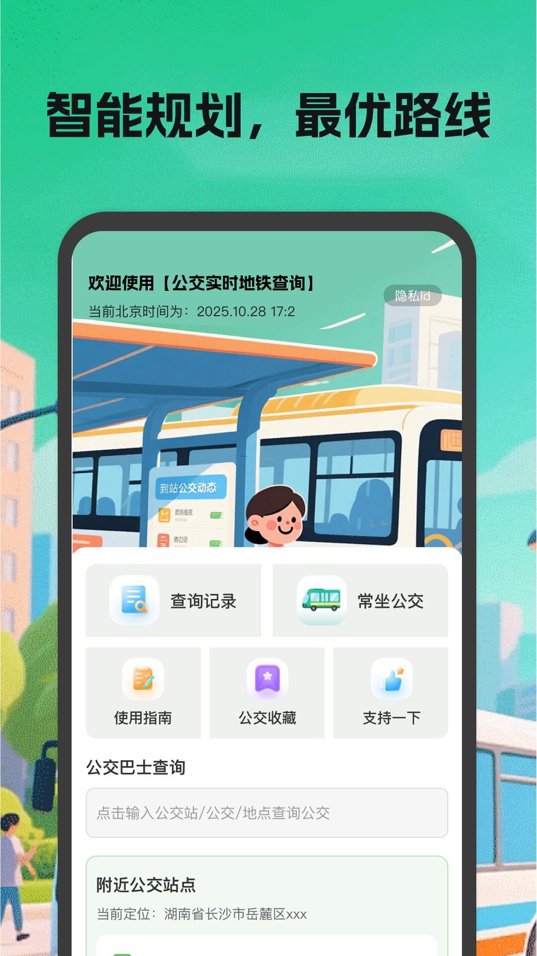本应用聚焦公交出行服务,为用户提供全方位便捷功能,具体如下: 精准公交查询:支持基于当前定位,查询所在城市的公交站点与公交线路;自动展示附近公交站点,用户可直接查看站点详情及途经该站点的所有线路,轻松掌握乘车信息。 个性化便捷功能:自动保存用户的公交查询记录,方便后续快速调取;支持对常用公交进行收藏、添加为 “常坐公交”,无需反复查询,提升使用效率。 实用出行辅助:提供线路规划功能,用户输入目的地后,可基于当前定位生成导航路线;内置公交使用指南,为用户解答乘车疑问;还附带手电筒、指南针、地铁线路查询等贴心小工具,满足多元出行需求。 特色公交打卡:支持用户添加想要打卡的公交,完成对应公交乘坐后即可打卡;系统会自动记录每月打卡情况,用户也可随时查询所有历史打卡记录,增添出行乐趣。